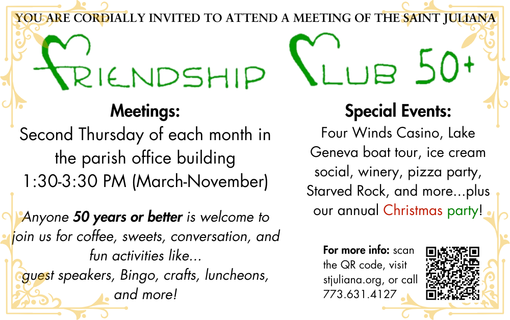 The Friendship Club prays together and responds to many needs our seniors may have and occasionally networks with seniors from neighboring parishes. Historically, the club has supported Saint Juliana School (some members are alumni). Many members remain active in the parish community as Eucharistic ministers, ushers, ministers of care, religious education teachers. We also work in the parish office and belonging to other parish organizations and committees.